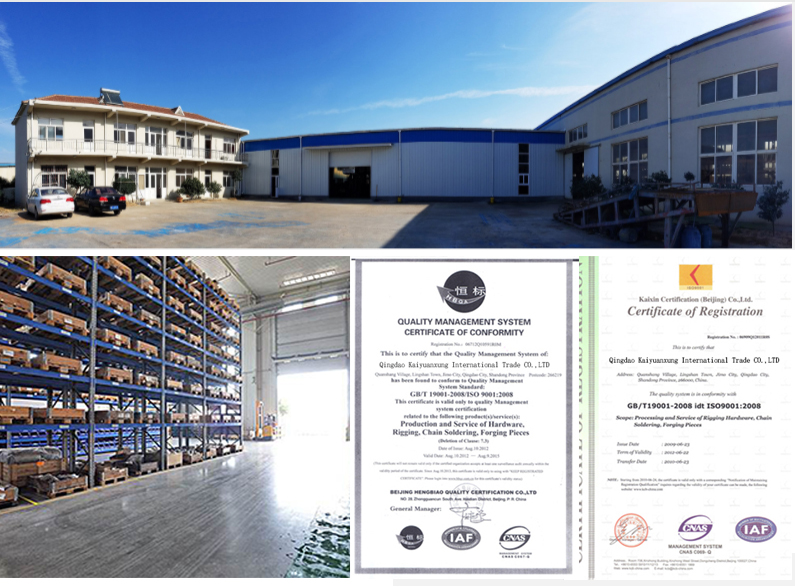 Qingdao Kaiyuanxung International Trade Co.,ltd is located in the famous city Qingdao, which is one of the largest material handling suppliers and exporters in China. We have been in the material handling producing more than 20 years. Now we have set up metal products factory and rigging products factory in Qingdao. The rigging products factory has more than 200 employees and covering 10000 sq meter workshops. The main products cover shackles, hooks, turnbuckles, wire rope clips, aluminum sleeves, copper sleeves, tie down straps, load binders, eyebolts and so on. The metal products factory has more than 150 employees and covering 8000 sq.meter workshops. The main products cover utility carts, wagon carts, security carts, basket trucks. Table and chair carts, wood dolly, tire, wheel chock and so on. all the products have passed strictly work load limited test, All the factories have passed ISO9001 and the products are assured by PICC. In order to anti COVID-19,we set up mask factory to produce masks. isolation gowns. medical giggles and so on. These products have passed CE and FDA certification! With good reputations, our products sell well in over North America, Europe, Asia and Australia. We set up strategical cooperation with several biggest companies in the industrial field. We will continuously adhere to the principle of mutual benefit and sincerely welcome friends to achieve a double win cooperation with us. Thanks!